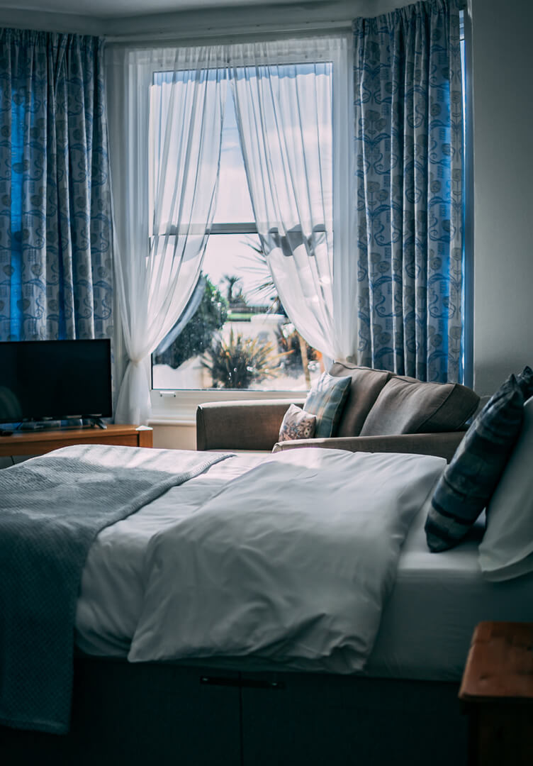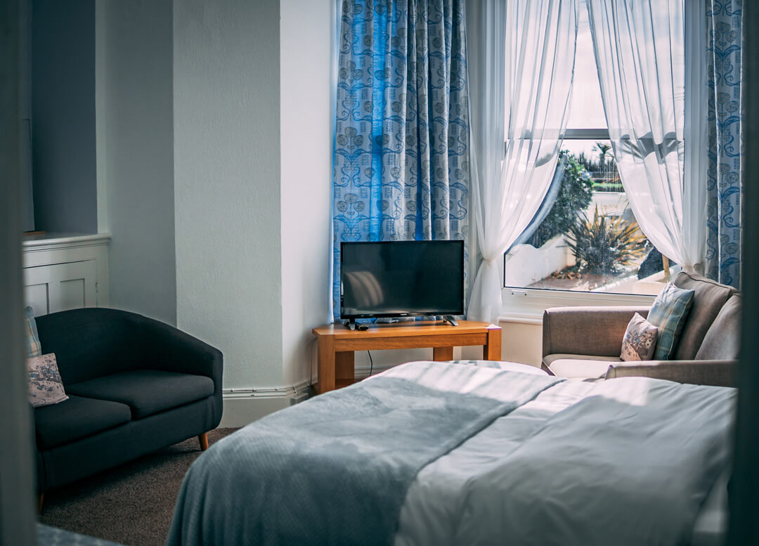 It comprises a pleasant, large bay windowed room looking out towards the sea. This has a double bed, three piece suite, dining table and chairs, TV and bedside and occasional tables.