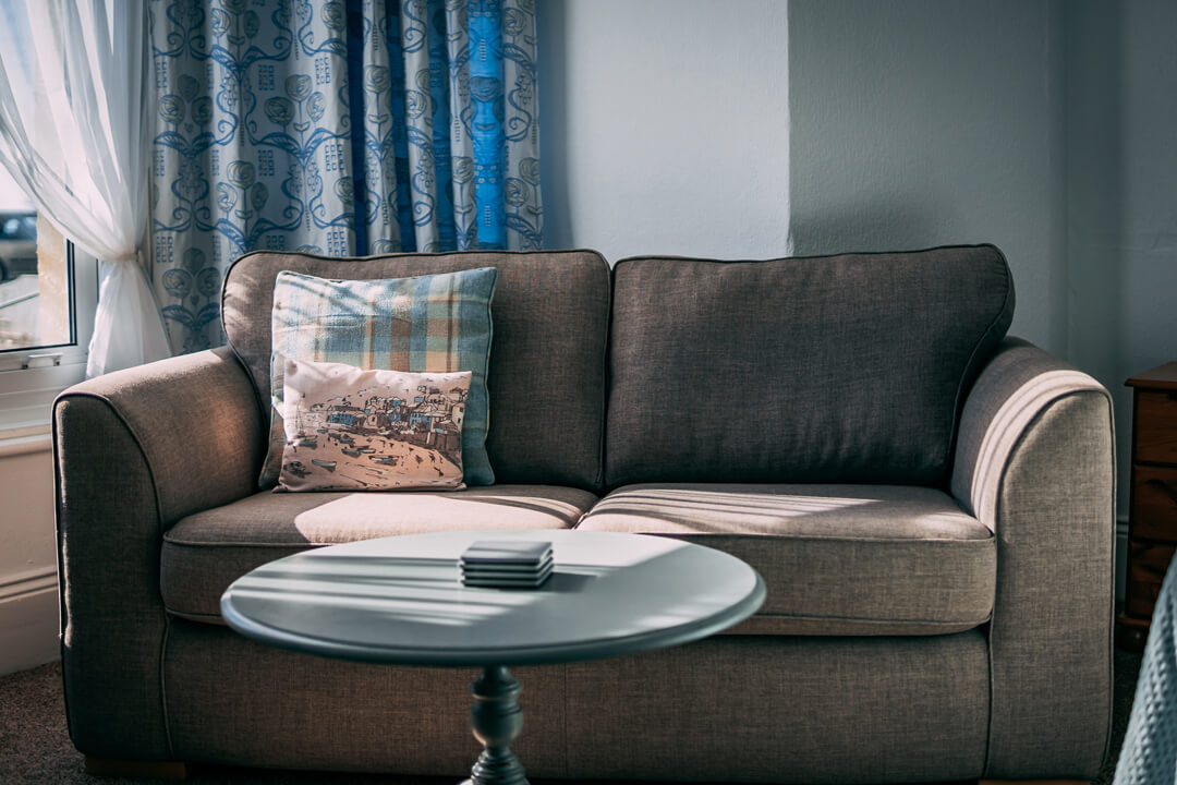 The lounge also overlooks the sea and has a comfortable comfy L-shaped sofa, and a TV.