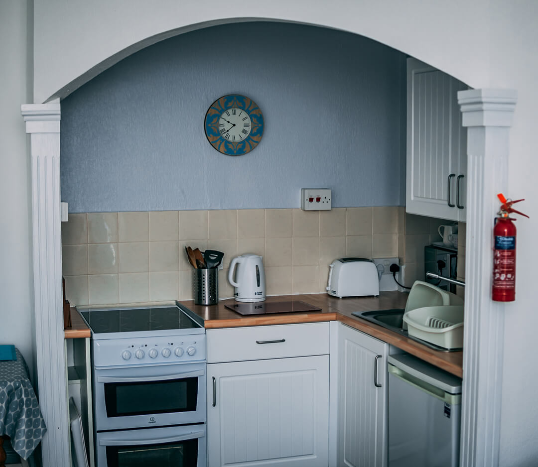 The kitchen area is in the corner of the main room through an arch and is fully equipped to include electric cooker, fridge, microwave, toaster and kettle.